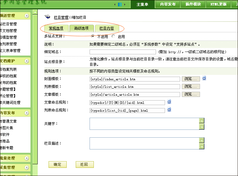 [3]初次使用DedeCms时,要注意建立栏目的一些常用选项: